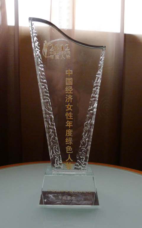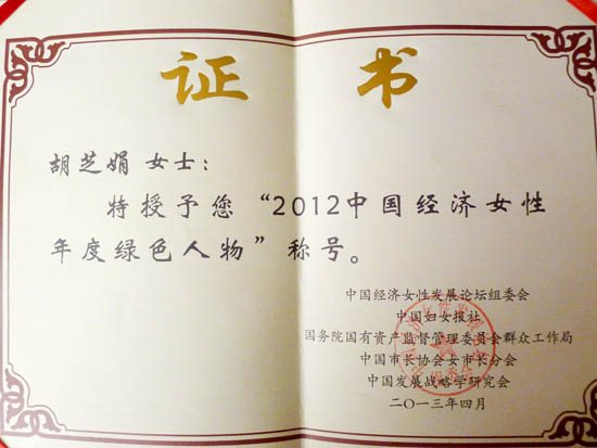 中国经济女性年度绿色人物是为嘉奖获奖人物及其所属企业在绿色节能环保事业所取得的显著成绩、为中国绿色家园建设做出的突出贡献而颁发。胡芝娟是公司的技术带头人,也是一名女博士,她曾获天津市“九五”立功奖章、“三八”红旗手、中央企业优秀共产党员、全国女职工建功立业标兵、全国建材行业十大女杰等荣誉称号。2012年,她还光荣当选党的十八大代表。