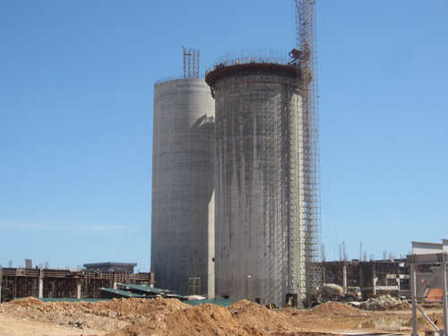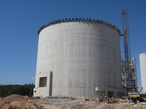 同林项目的生料库,直径22.5米,高69米,储量2.4万吨,滑模工程混凝土量约4500立方米;熟料库直径40米,混凝土部分高31.25米,储量5万吨,滑模工程混凝土量约2500立方米;水泥库1、2号库直径18米高52米,储量1万吨,滑模工程混凝土量约2400立方米。