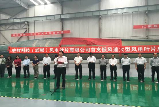邯郸市市委常委、市政府常务副市长曹子玉,市人大副主任李士海,市政府副秘书长魏彦君,中材科技党委书记宋伯庐,金风科技交付中心总经理许磊,泰山玻纤常务副总经理呼跃武,中材叶片副总经理庄琴霞,北玻有限副总经理方晓敏等出席叶片下线仪式。下线仪式由中材科技副总裁、中材叶片董事长赵俊山主持。