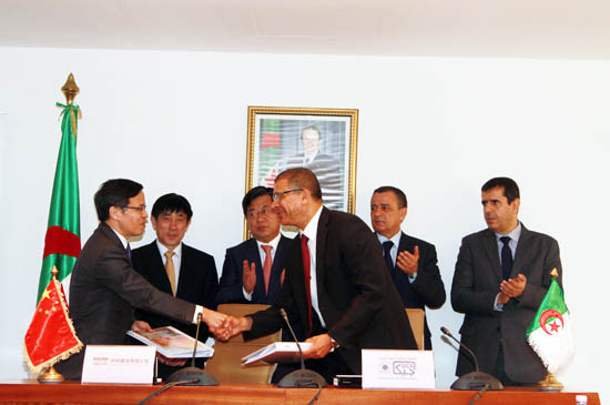 阿尔及利亚工业部部长Abdessalem Bouchouareb,中国驻阿尔及利亚大使杨广玉,GICA集团总裁GESSOUM Rabah,中材股份总裁彭建新出席合同签字仪式;SSC水泥公司总经理MEKNASSI Mohamed、中材建设董事长童来苟代表双方在合同上签字。