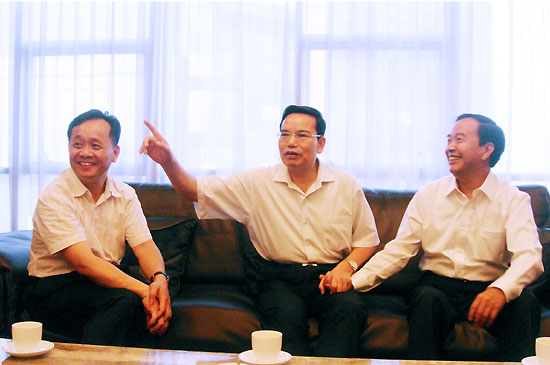 广东省原省委常委梁伟发(中)、云浮市市委书记黄强(左)、集团党委书记于世良在一起亲切交谈