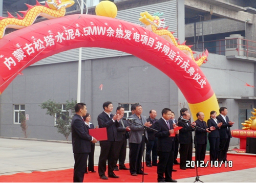 本网讯 10月18日,由中材节能股份有限公司承建的内蒙松塔水泥公司4.5MW余热发电项目并网发电。内蒙哈伦能源集团董事局主席牛惠斌、总裁韩成东,中材节能工程部部长周少宗等出席了在松塔水泥公司举行的庆典仪式。