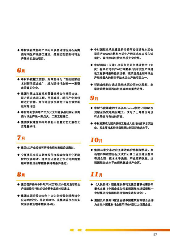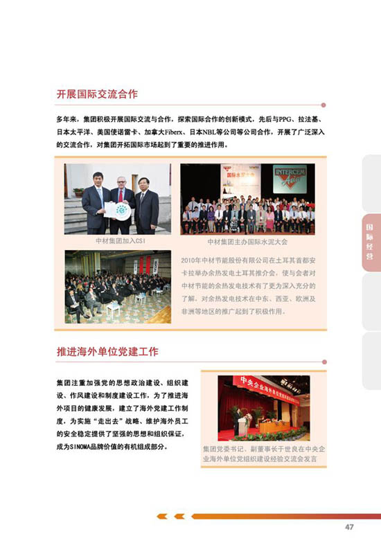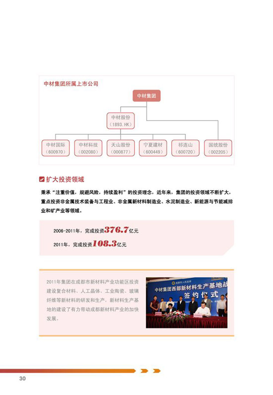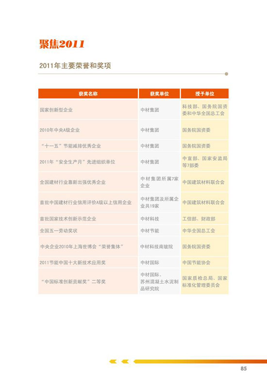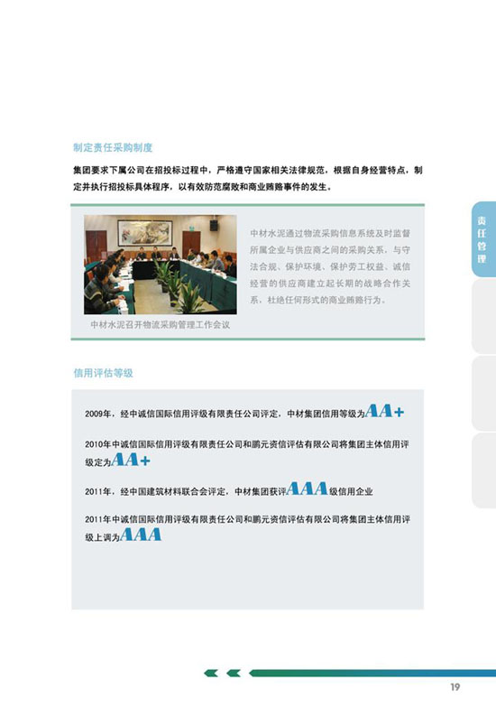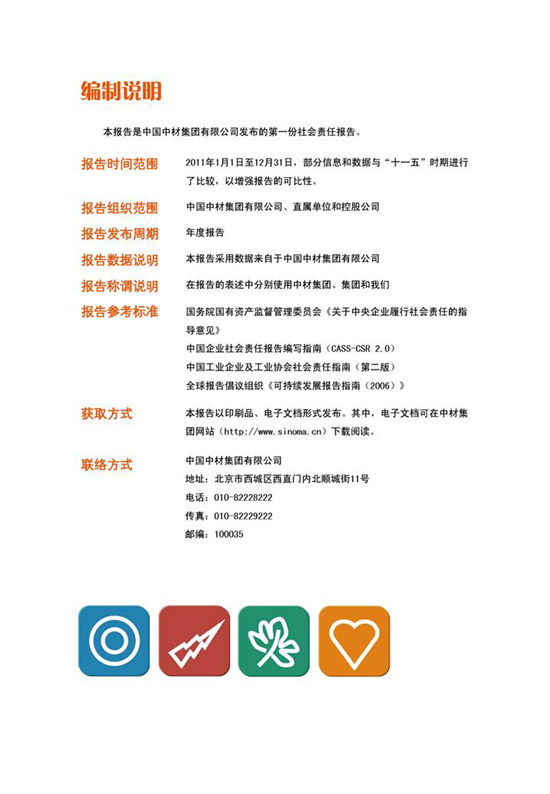 《中国中材集团有限公司2011年社会责任报告》的编制经历了前期准备、工作启动、资料收集、议题确立、撰写与审核等5个阶段,从2011年12月召开启动大会到2012年11月完成报告发布,共历时10个月。中材集团未来将以此次发布社会责任报告为契机,深入完善全员参与、措施得力的工作机制,进一步在国内外履行好企业公民责任,为实现集团公司战略发展目标提供有力保障。