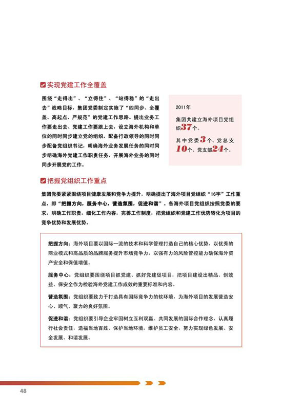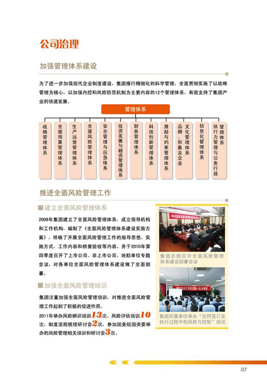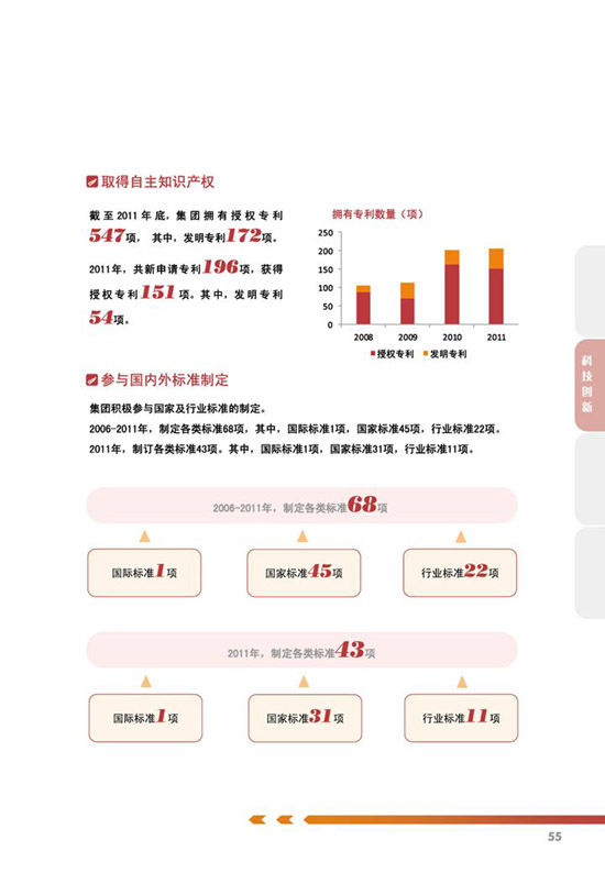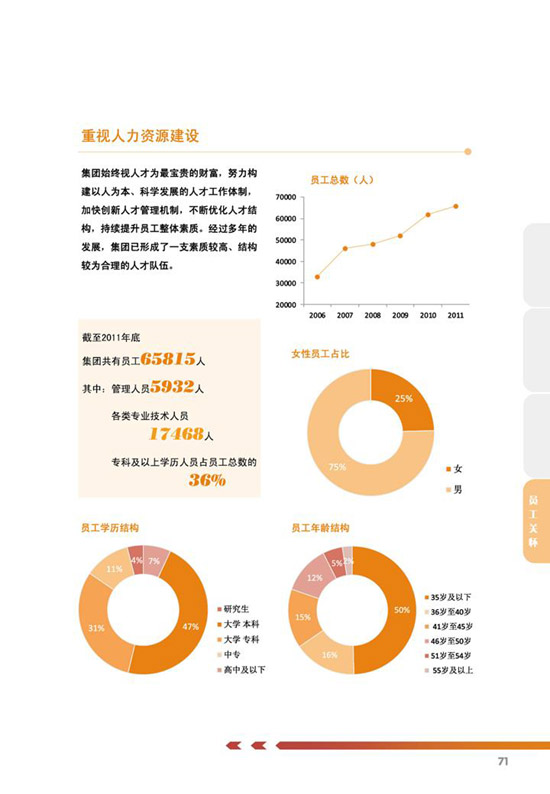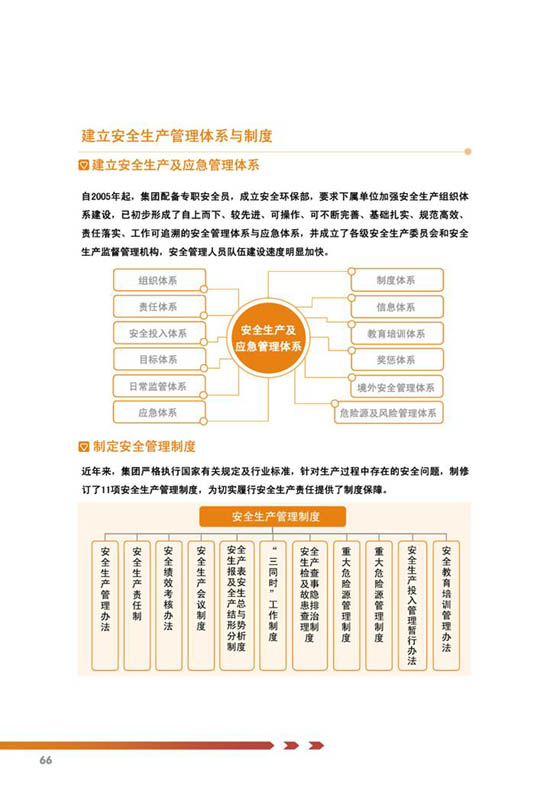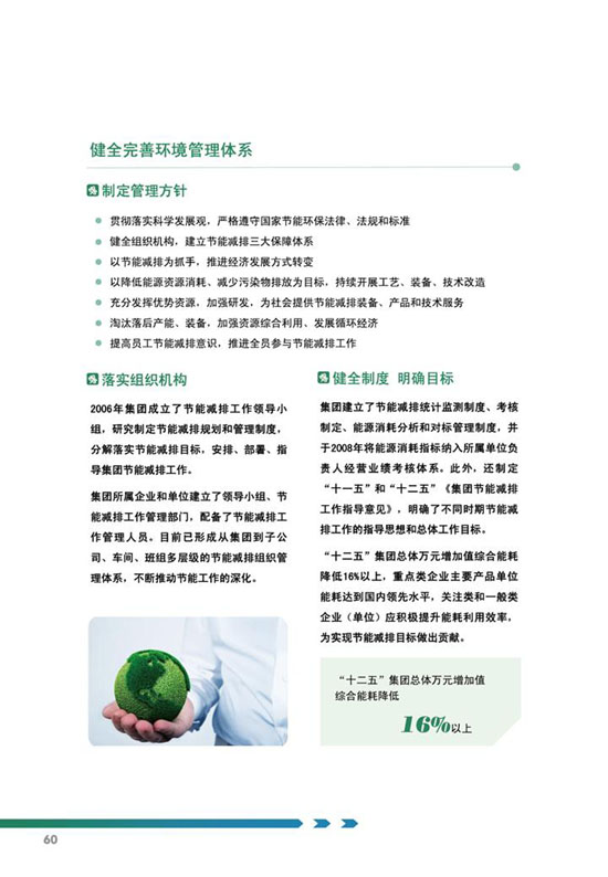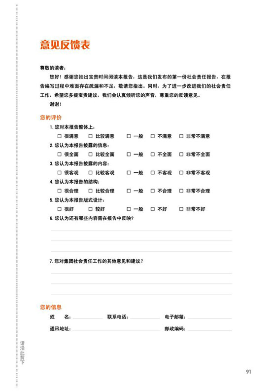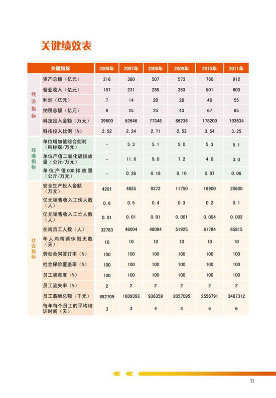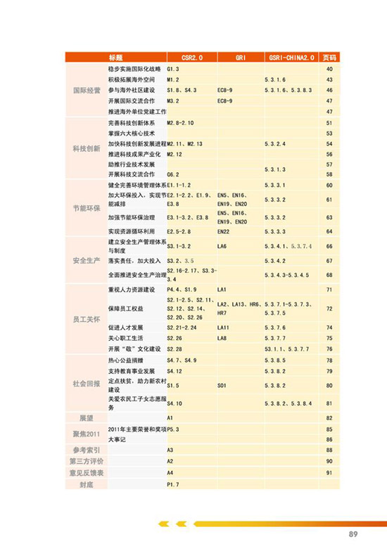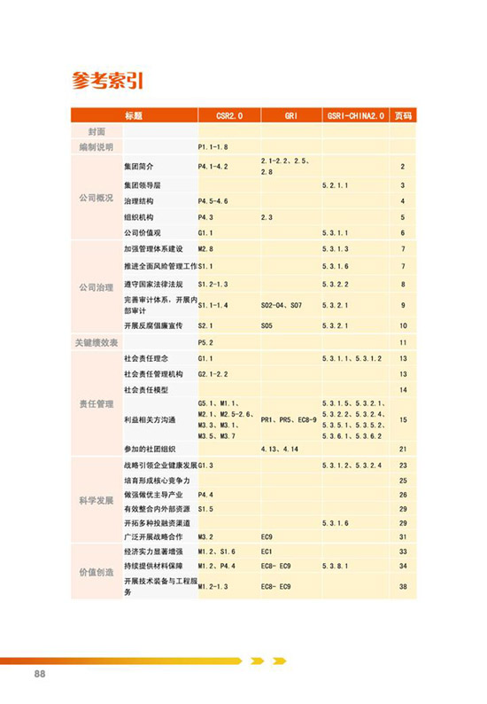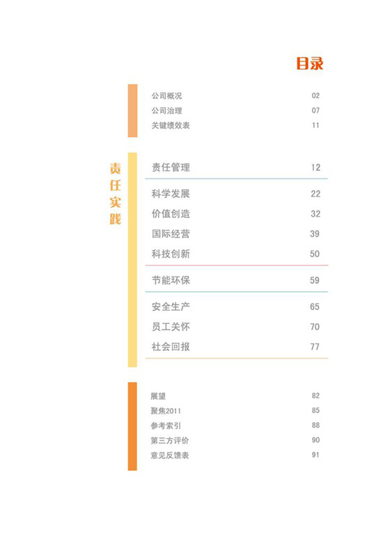 编制说明、公司概况、公司治理、关键绩效表、责任管理、、科学发展、价值创造、国际经营、科技创新、节能环保、安全生产、员工关怀、社会回报等。