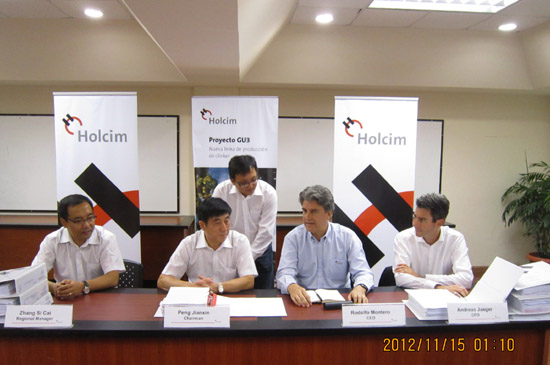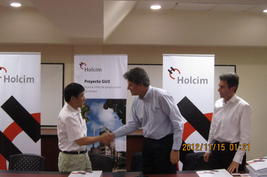 出席签字仪式的还有Holcim瑞士总部的执行委员会成员 Mr. Andreas H. Leu,Holcim瑞士技术中心美洲区的区域经理Mr.Dirk Wimmert,业主方的项目经理 Mr. Jaime Trevino,业主方的技术经理 Mr. Henin Thinkanamp,中材国际天津公司厄瓜多尔项目部经理胡小军,市场部客户经理魏治国,项目部副经理毕志鹏,项目部技术经理姚联国,项目部高级商务经理李宁等。
