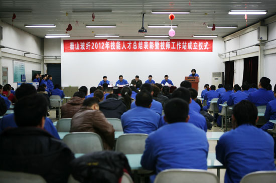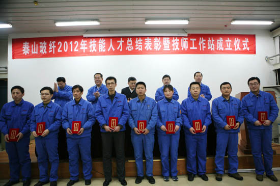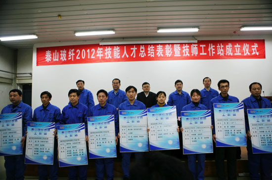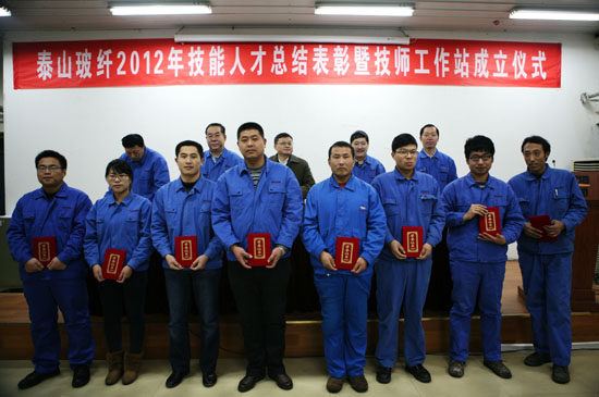 本网讯 2012年12月29日,泰山玻璃纤维有限公司隆重举行了2012年技能人才总结表彰暨技师工作站授牌仪式。泰山玻纤董事长、总经理唐志尧出席会议。唐志尧强调,企业发展以人为本,人才发展以用为本,技能人才是公司人才队伍的重要组成部分,没有一流的技术工人,就没有一流的产品。