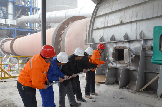 中材国际天津公司项目总监兼工程管理中心副主任李振兴、古浪项目经理赵森、副经理邢艳青,业主项目经理蒋朝辉、副经理吴永成参加点火仪式并共同点燃回转窑,点火一次成功。