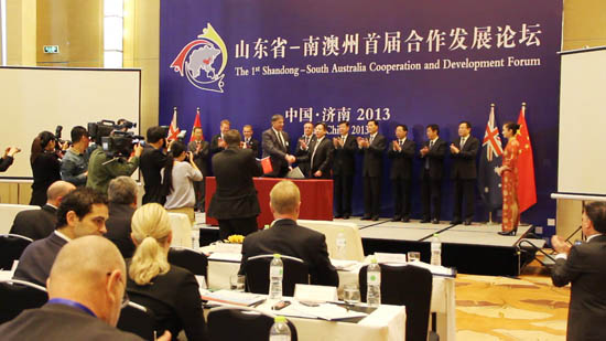 本次签约是在当日举行的“山东省—南澳州首届合作发展论坛”上进行的,山东省委书记姜异康、南澳州州长韦瑟里尔(Jay Weatherill)、山东省副省长夏耕出席论坛并见证签约,中材金晶董事长、总经理王建与贝斯泰克董事长查尔斯 (Charles Figallo)代表双方在谅解备忘录上签字。南澳州政府暨企业代表团全体成员,山东省有关部门和企业代表200多人参加论坛。
