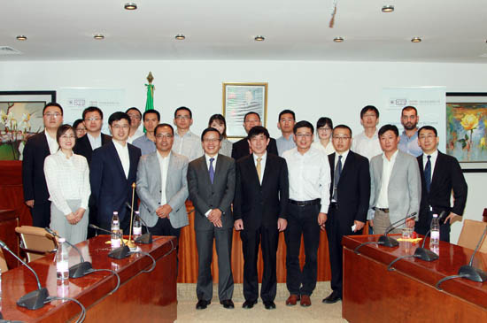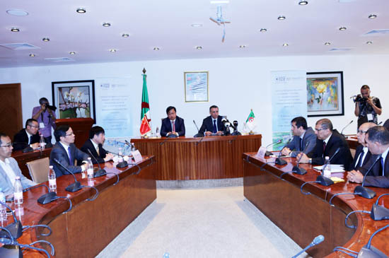 阿尔及利亚工业部部长Abdessalem Bouchouareb,中国驻阿尔及利亚大使杨广玉,GICA集团总裁GESSOUM Rabah,中材股份总裁彭建新出席合同签字仪式;SSC水泥公司总经理MEKNASSI Mohamed、中材建设董事长童来苟代表双方在合同上签字。