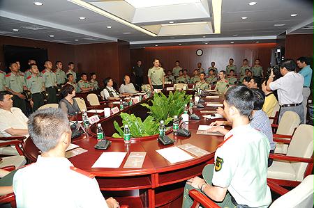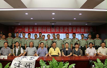 军歌嘹亮,军民情深。在“八一”建军节来临之际,8月1日上午,国资委直属机关工会与委机关服务中心、委书法协会、中国东方书画摄影研究会,联合召开慰问驻委武警官兵座谈笔会。中华全国总工会办公厅、国资委直属机关党委、国资委机关服务中心的有关负责同志,国资委书法协会、中国东方书画摄影研究会的7位书画家,武警北京总队二师七支队领导以及驻国资委的60名武警官兵参加了座谈会。